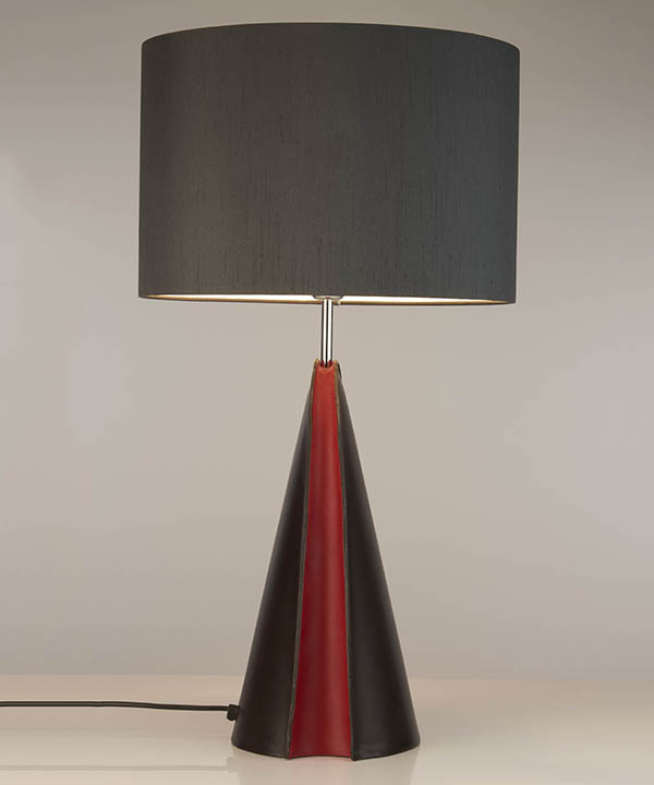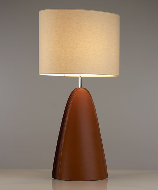 Chad expands its leather range with the new table light, Barcelona. With a distinctive arch shape, Barcelona is suitable for public areas, living rooms or as a large bedside light. The central cleft, in contrasting leather colour adds flair to the design. Different leather combinations can be specified.