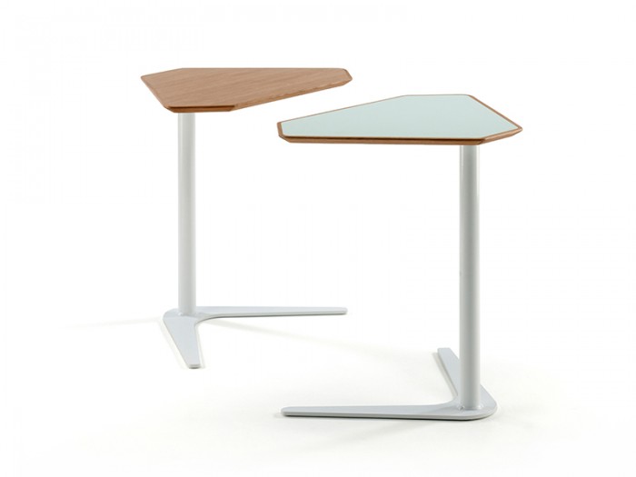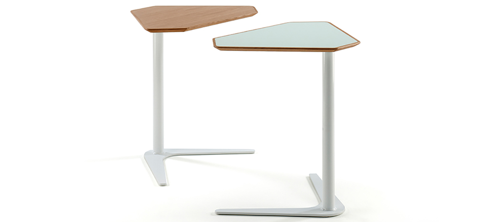 The latest Metro laptop table from Morgan is inspired by the form of a boomerang. The foot of the metal base is shaped and scaled for ease of use and the table top is a geometric form based loosely on a triangle with squared corners. Offered with a solid wood lipped detail and a variety of laminates, this laptop table offers a lightweight and versatile solution.