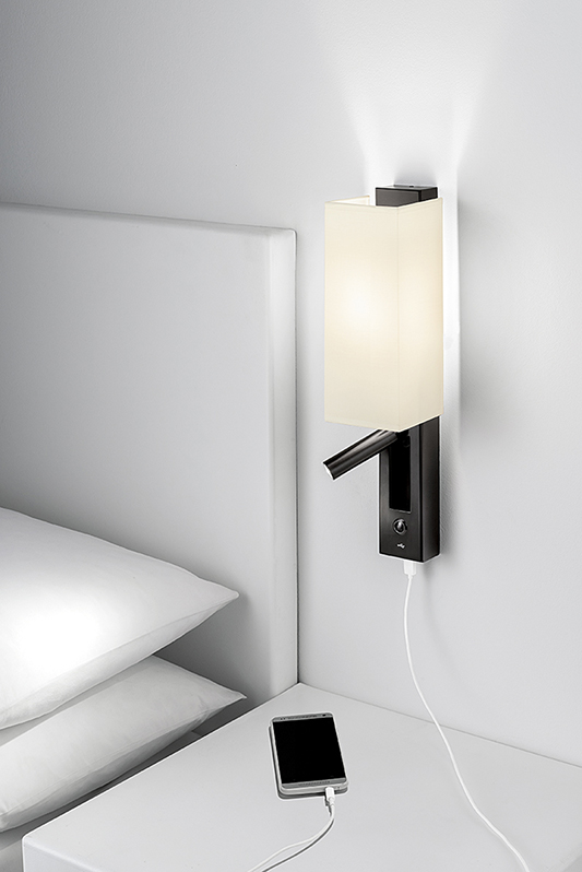 A warm white LED reading light is housed within a cylindrical head that swivels 90 degrees and ‘docks’ into a semi recessed backplate. The innovative wall light also features a USB charging port which remains powered even when the lights are switched off.
