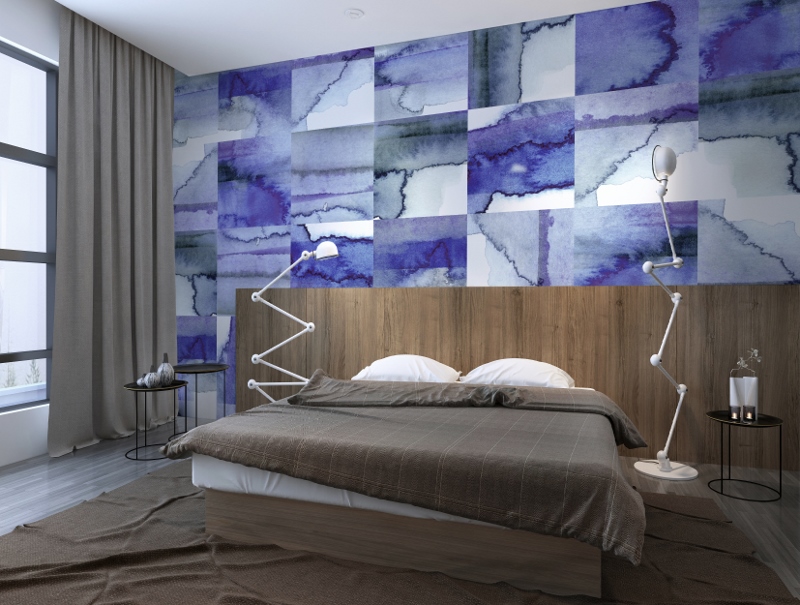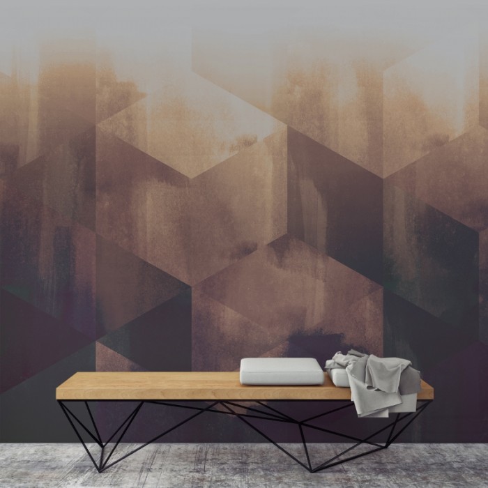 Watercolour Geometric is a large scale fusion of geometrics and watercolours. Nebulous indigos and luminous opalescent shades combine with hazy, weathered surfaces which fade in a vertical ombre effect.