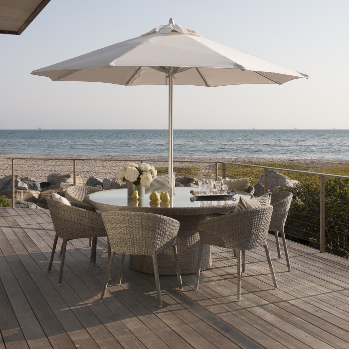 Strada’s playful dining tables coordinate effortlessly with the bucket seat Armchair and curved-back Side chair. Pair the chairs with the Round Dining Table or Oval Dining Table for unique arrangements. Both dining tables feature JANUSfiber pedestals and three top styles: fully woven, inset glass, or stone.