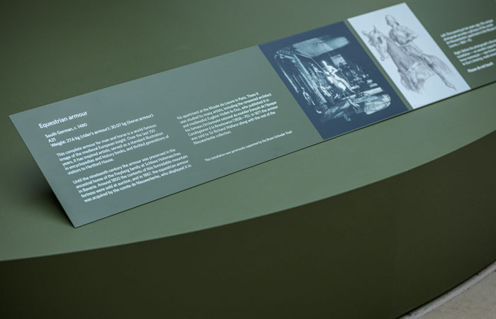 Until the nineteenth century, the fifteenth-century equestrian armour was preserved in the ancestral home of the Freyberg family at Schloss Hohenaschau in Bavaria. Around 1850 the contents of this formidable mountain fortress were sold at auction, and the armour was acquired in 1867 by the Comte de Nieuwerkerke, who displayed it in his apartment at the Louvre in Paris. In 1871 the armour was sold to Sir Richard Wallace, along with the rest of the Nieuwerkerke collection. Now, for the first time in over 100 years, the armour will be redisplayed for a limited time at the centre of the building’s courtyard café, beneath the glass-roofed central atrium. The new display sees the knight-and-horse armour set on a bespoke green circular plinth, complementing the greenery of the courtyard area, with information graphics highlighting key moments in its history including a photograph of its former home in the Louvre, and new graphics on the windows to set the scene of encountering the armour within a wood or forest.