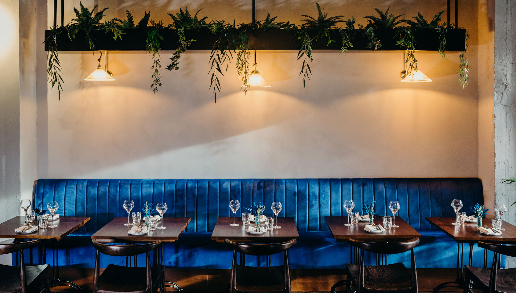 The client wanted to also cater to parties of all sizes, so the design featured a six-metre-long banquette seating on one side of the space with a scalloped detail covered in Prestigious Textiles’ Velour Indigo fabric. The banquette seating was custom made by John Drummond Furniture in Cork. This gave the client the flexibility to have various sized parties and it became one of the main focal points of the restaurant.
