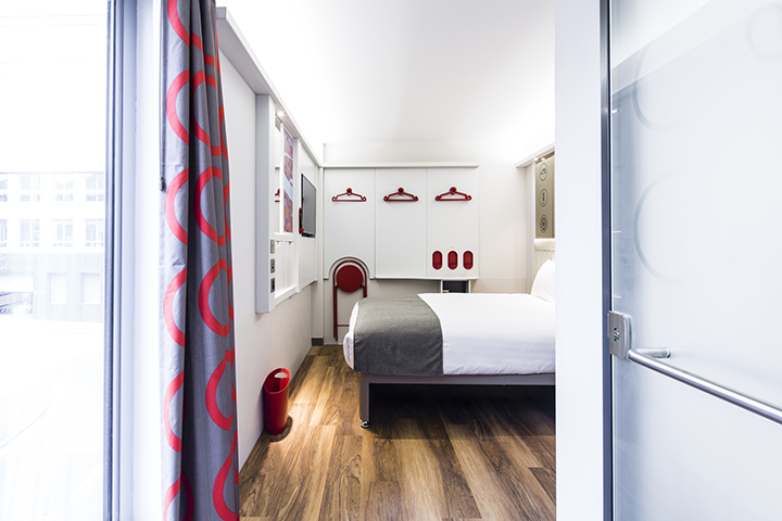 The Point A project had limitations due to extremely small bedrooms. It was impossible to get in and out of the room with a suitcase without potentially damaging the walls. The floor-plans narrowed down our options of using loose furnishings as everyday furniture would not withstand such impact or even fit in the bedrooms. Instead, I designed in-built amenities on MDF panels that had to be secured onto the walls. Because of it’s durable and lightweight reputation, I was confident with using Kydex® to protect the panels which housed the tv unit, shelves, storage, headboards, mirrors and information panels.
