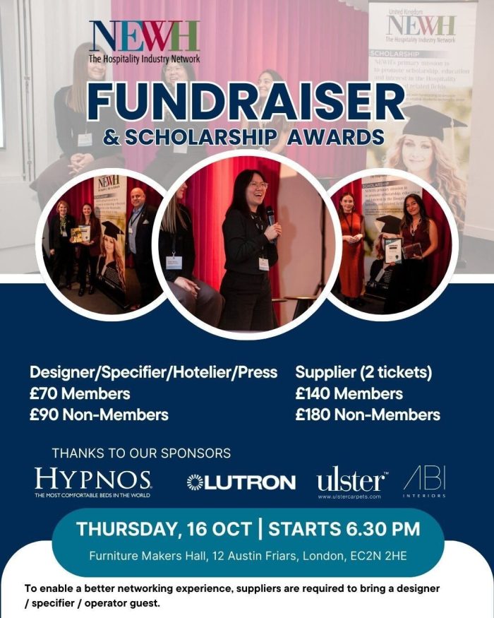 The NEWH UK Chapter continues to open doors for emerging talent by bridging education and industry, supported by a global network of hospitality professionals. With the help of generous sponsors — Hypnos Beds (Headline Sponsor), Ulster Carpets, Lutron, and ABI Interiors — the event ensures that funds raised directly support future scholarship winners.