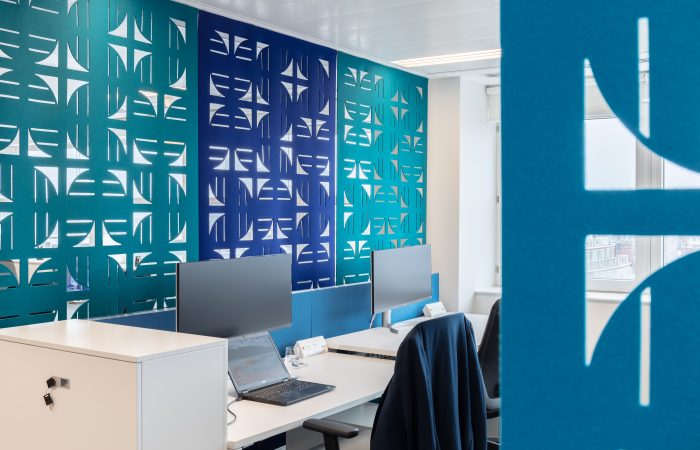 Creating a feeling of spaciousness meant maximising light and breaking open the cellular aspect of the inherited office space, as well as being playful with colour. The space-plan includes an open-plan office area, plus closed and open meeting spaces, solo working booths and private phone booths for discreet conversations with clients and consultants.