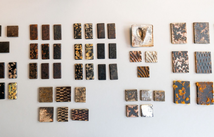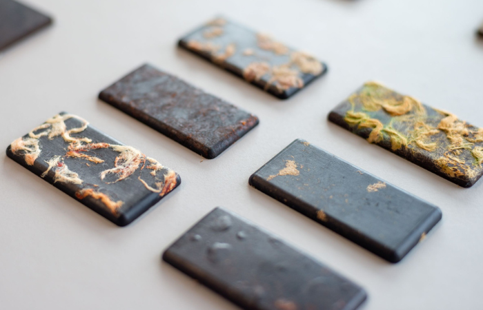 N8040’s black resin limits pigmentation and has historically scored low on perceived beauty and sustainability. Jansen’s response is not to mask these qualities, but to amplify and aestheticise them. By adding fibres, including flax and wool, as well as fibres coloured with fungi and bio-based pigments, she introduces visual depth and material storytelling. Through processes such as sandblasting, accelerated weathering and lab simulations of wind, moisture, UV and biological colonisation, Living Traces anticipates how the material will age. Facade panels are designed to gradually reveal fibres, develop patinas, and even invite algae or mycelium growth.
