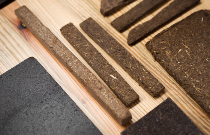 Dungse Labs pushes this logic into more provocative territory by working with one of agriculture’s most abundant and under-valorised by-products: cow dung. Drawing inspiration from Himalayan building traditions and combining them with modern processing techniques, the team has developed a material system that replaces wood, particle board and plastic with dung-based composites.