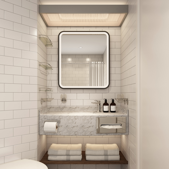 Each guest cabin bathroom was fitted with bespoke front illuminated bathroom mirrors, manufactured from marine grade stainless steel and finished with safety backing for enhanced durability. In addition, Luma supplied marble effect vanities with integrated accessories, as well as durable laminated shelving. These elements were all designed in close collaboration with the client to address the spatial constraints typical of cruise ship bathrooms, ensuring the finished product met high standards for both design and usability.