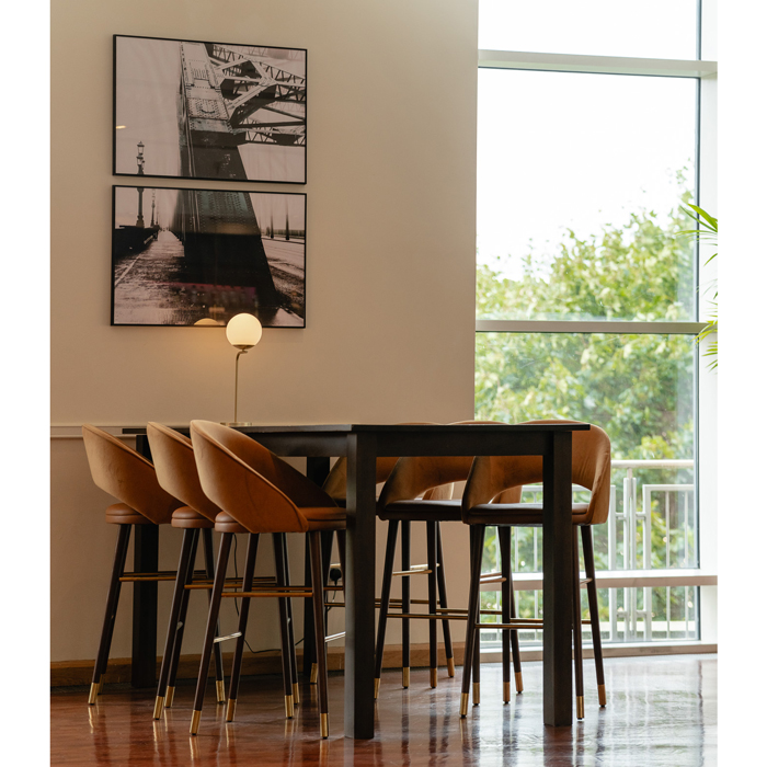 Furniture Fusion’s Sinatra chair also appears in a warm ochre yellow which works well with the solid ash tabletops. The bar stools from the Sinatra collection are upholstered in a deep ruby-coloured leather and velvet fabric, adding warmth to the light and airy bar area, and working well with the high bar tables.