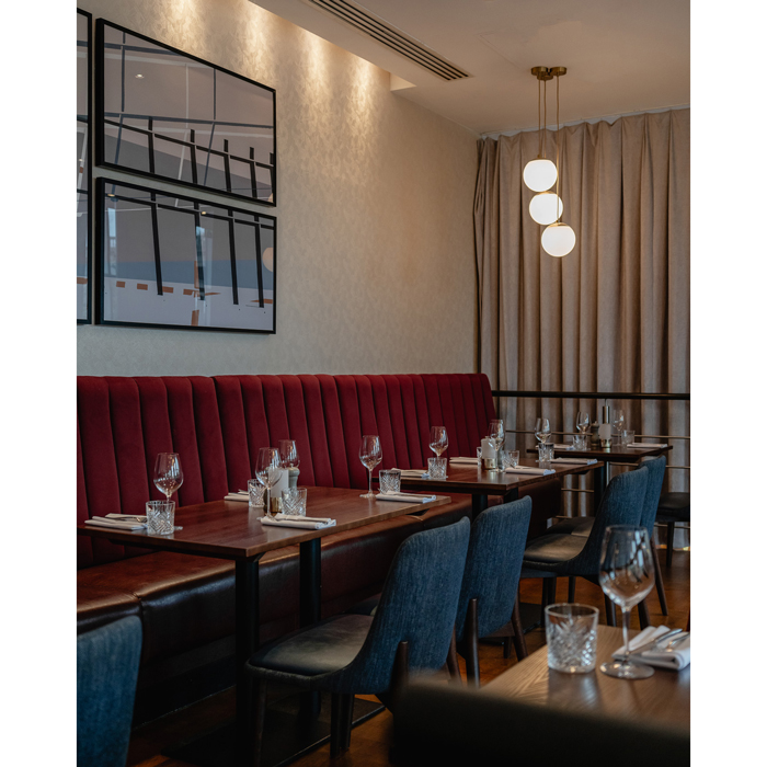 Furniture Fusion’s team always enjoy an opportunity to create bespoke pieces for a project, delivering something unique that was designed to the client’s specifications. It is something that they pride themselves on get excited about in any project. The Hilton Gateshead Newcastle’s’ riverside restaurant is a popular choice for guests and other diners and therefore needs to be able to cater for everyone from solo diners, families, and friends through to large groups. Once the design had been finalised, and the frame made, the bespoke banquette seating was upholstered in a warm burgundy leather and an abstract patterned fabric. These look great alongside the Sinatra chairs, which are upholstered in a navy fabric and leather. The banquettes give the contemporary look of fixed seating but are moveable, allowing the restaurant operational flexibility in terms of changing layouts to respond to demand throughout the changing needs of clients and guests.