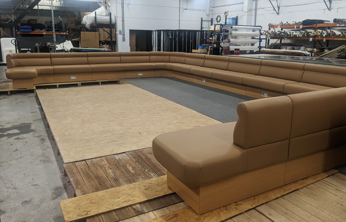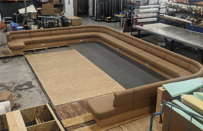 Working closely with Lisa Burdge, Co-Owner of Olympic Studios, Rhubarb’s Design Director quickly developed the original drawings of the banquette configuration provided by the project design team into a final design, taking into consideration comfort and functionality. The Rhubarb team discussed and advised the client on leather options and Crest Cromwell Sahara was the choice – a beautiful full grain aniline leather, with a butter-soft finish. A modular approach was very deliberately chosen for the build which enabled the maximisation of the space in the club area but also meant Rhubarb had the flexibility to adjust the configuration when it was discovered at the install, the day before the soft opening, that a wall had appeared which had not been on the original plans!
