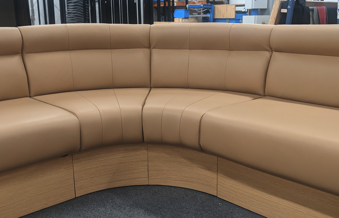 Rhubarb’s expertise in seating, alongside their bespoke design and upholstery skills, meant they could overcome the challenges of maintaining consistent seam lines across multiple curved modular units, and ensure a high-quality finish. They accommodated room layout changes and specific delivery slots to the listed building’s designated loading bay and liaised with the client to accommodate installation around other third parties working on-site.