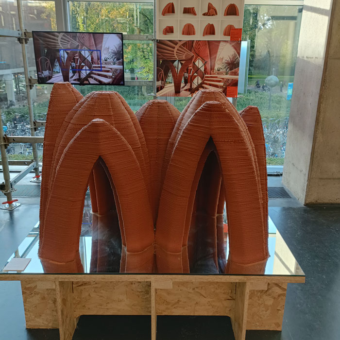 The work on display very much suggests that 3D Printing promises to revolutionize the way we design and build our cities. Working at such a large scale requires malleable materials that are up to the job of constructing seamless and durable structures. The 3DPA research program at IAAC explores how clay and earth-based materials, which were commonly used as construction materials before the start of the Industrial Revolution, might come into effect. Working closely with 3D specialists such as Italian brand WASP, they propose a synergy of digital design and fabrication in their approach to making, which could produce a wide variety of building styles that can adapt to the local context, that is climatic, cultural, and economic. Their 3D printing explores complex geometries with an emphasis on the application of façade systems that are both visually arresting and functional. And as the organisers are keen to point out, unlike most of the most commonly used building materials today – concrete, steel, and glass – clay and derived earth-based material systems demonstrate a significantly reduced CO2 footprint and a higher potential for reuse and recycling.
