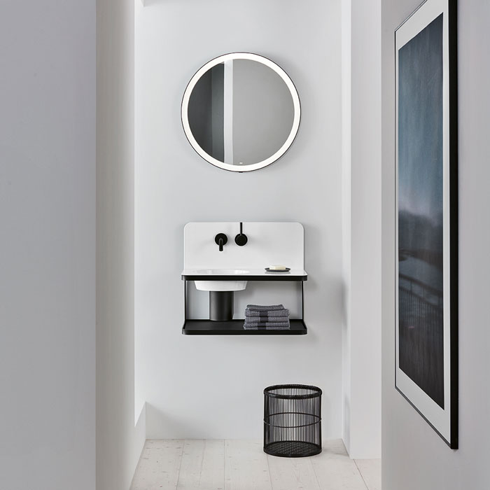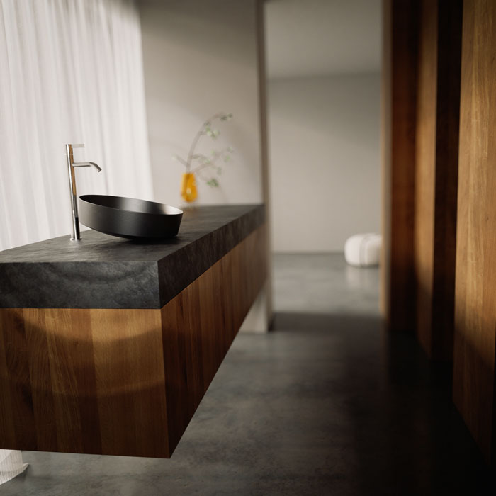 Tendo redefines conventional bathroom design with its elegant, dynamic tilt inspired by the natural gesture of cupping hands to hold water. Water cascades gracefully down the inclined surface, emulating a tranquil waterfall, bringing an element of calm and serenity to the bathroom. This visually captivating basin, on show in Matt Black, is both practical and artistic – ideal as a striking centrepiece in contemporary bathrooms.