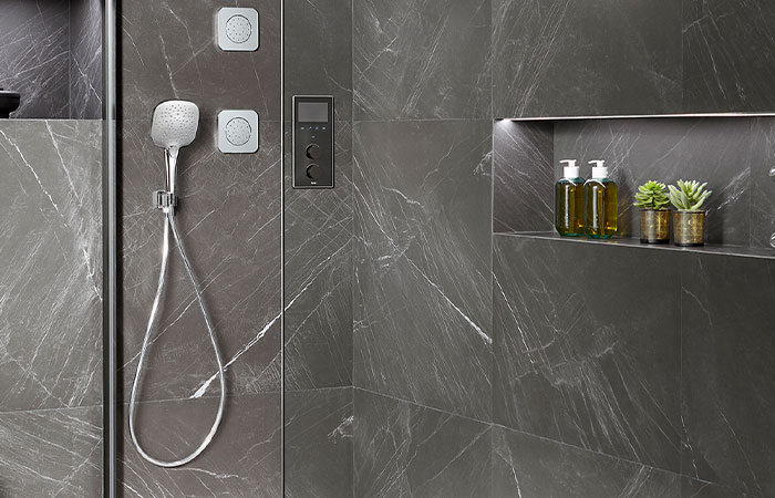 The intelligent control has a sleek, simple interface and allows up to three users within the same household to pre-set their desired settings. They can set their shower duration, maximum temperature and flow rates all based on their own individual needs. The interface features a colour LCD display and touch-sensitive controls with soft turn dials to ensure it is extremely easy to use and control. The Smart Shower system can install two or three outlets including a Raindream showerhead, handset and Puzzle Square Jets. If homeowners select the three outlet option, the clever design allows two of them to work simultaneously.