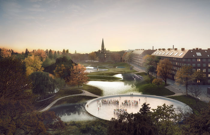 Other schemes show how we can channel floodwater through ‘blue-green’ infrastructure solutions, where water is allowed to enter the built environment, but is safely directed to a parkland. Copenhagen-based architectural firm SLA’s scheme The Soul of Nørrebro does just this, creating a new model for flood management by using the city’s frequent downpours to feed an urban wetland area.