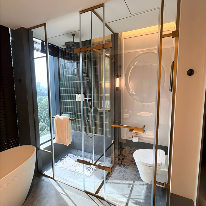 Roman’s subsidiary in Kuala Lumpur serves as a crucial hub for specifications across the Asia Pacific region. From the project’s inception, Roman collaborated closely with the design team to create custom solutions that seamlessly integrated the bedroom and bathroom spaces. The brief called for bespoke doors and panel solutions, and Roman manufactured and furnished 290 enclosures throughout Hotel Indigo with their Liberty Shower Enclosures which incorporated towel rail handles in a brushed rose gold finish.