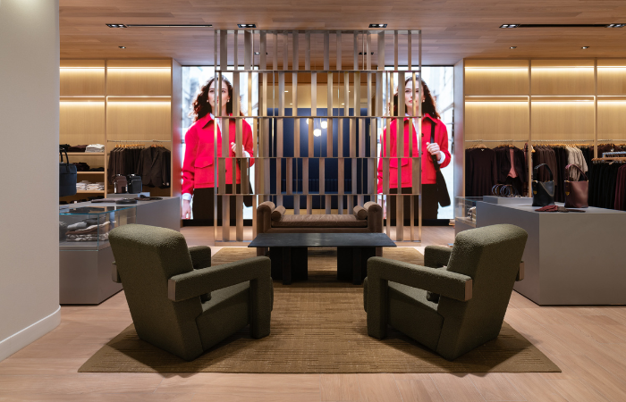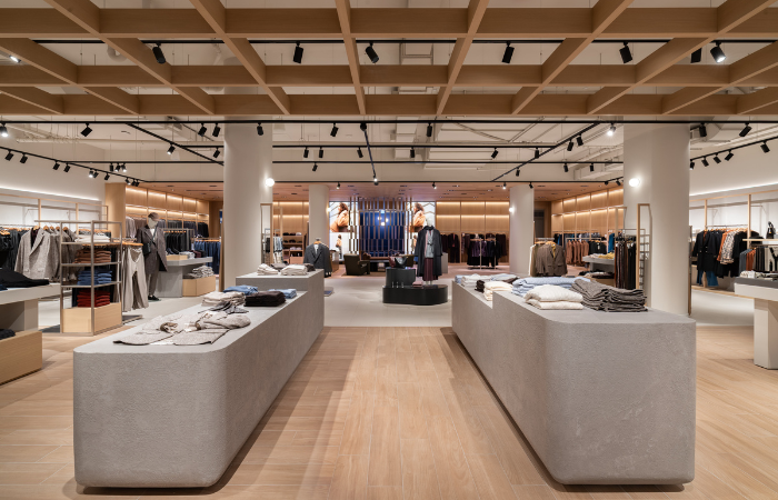 ‘Living lookbooks’ throughout the store showcase a curated, lifestyle-oriented selection of products from the brand’s collections. These lookbooks are presented through mannequins, large tables in the center of the store, and lifestyle screens. The goal was to create an element of storytelling that encourages customers to shop across categories and discover more of the clothing range. The store also includes accessory tables, interwoven in different points throughout the store, showing how individual looks can be personalised.