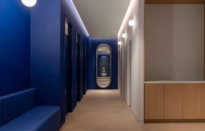 At the center of the Occasion Destination is a lounge area that serves as a dedicated waiting space for the 10 spacious fitting rooms behind. Dalziel & Pow created an ‘Instagrammable’ entrance to the fitting rooms, featuring bold mirrors that are perfect for social media moments.
