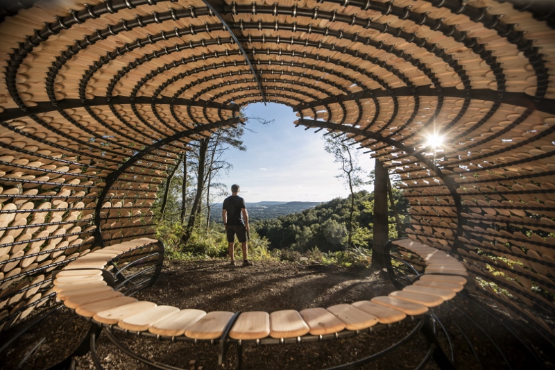 At its core, the shingles overlap and the sculpture functions architecturally to protect and shield the user from the elements, but at its mouth the surface flattens and evocatively opens out as the shingles appear to fly out towards the stunning valley.