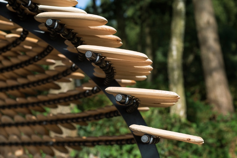 Inspired by the words and messages etched by people in public places, on trees, benches and elsewhere, Giles Miller has collated poetry, messages, initials and messages of love and memory from local schools, residents and other contributors to the project. These messages have been etched onto the surface of the organic cedar shingles that cover the piece, and appear to throw themselves out towards the front of the sculpture as if voicing their sentiments to the world that opens up below.