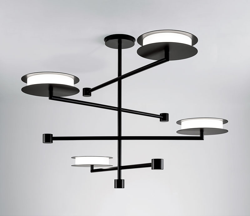 A true statement centrepiece, Custom Orion features shallow circular LED light sources with Opal acrylic diffusers sandwiched between top and bottom discs supported by randomly positioned arms to give an asymmetric effect. Clients can specify dimensions and shapes as well as finish. The pendant can be created with a long drop suitable for stairwells and atriums and there is a matching wall light.