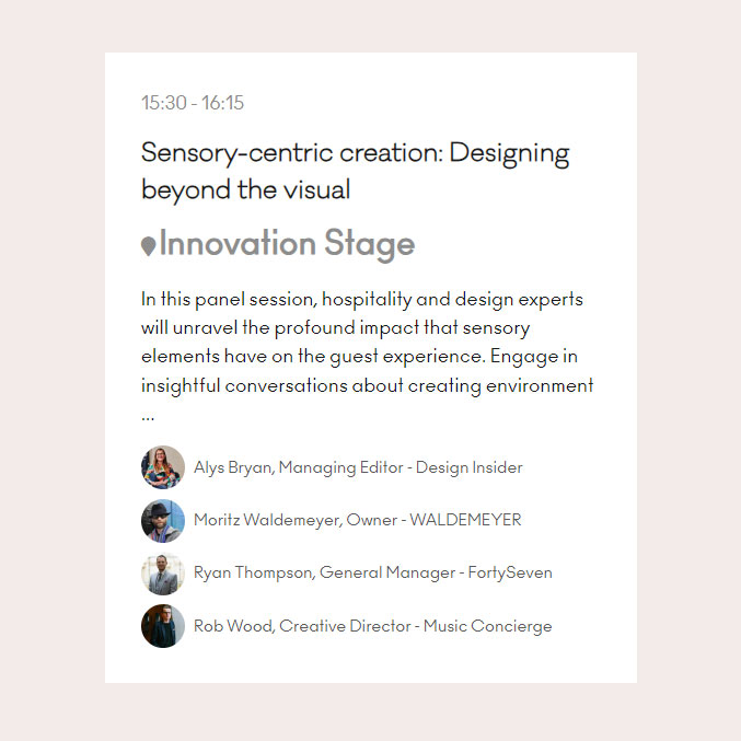 Design Insider is delighted that our Managing Editor, Alys Bryan, will step onto the Innovation stage to moderate an in-depth conversation with industry leaders which will unravel the impact that sensory elements have on the guest experience. Alys’ guest speakers will include Moritz Waldemeyer, Owner of WALDEMEYER, Ryan Thompson, General Manager at FortySeven and Rob Wood, Creative Director at Music Concierge.