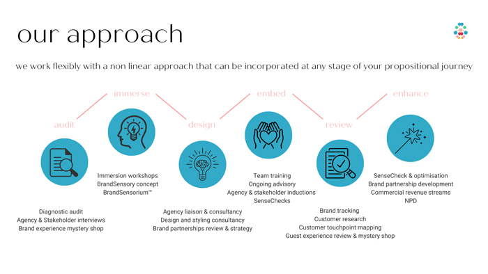 We tailor the work to the needs of our clients, typically involving six phases: audit, immerse, design, embed, review, and enhance. We always start with an audit and immersion, as this helps to get everyone aligned and dig deeply under the skin of the brand to establish the sensory profile. But it is a deliberately non-linear process, allowing us to flex it depending on where the brand is on their propositional journey. For instance, if they are clear about who they are and how it feels to be in their world, we might not need to do much more than capture it for them: simple performing an audit and immersion so they have the tools to consistently implement even in the light of key personnel change. Conversely a new brand might require design support and help embedding the sensory elements through their business. Or an established brand might need to have a review of their guest experience, make some enhancements, and then perhaps go back into design for key areas of focus.