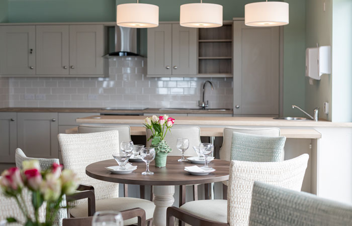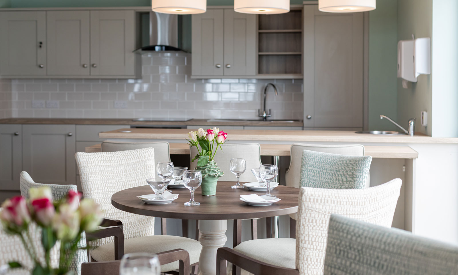 For the dining area, the elegant Woodbury dining table with a traditional turned wood leg was selected with the Assisi Dining Chair with a wooden arm to assist residents when standing.