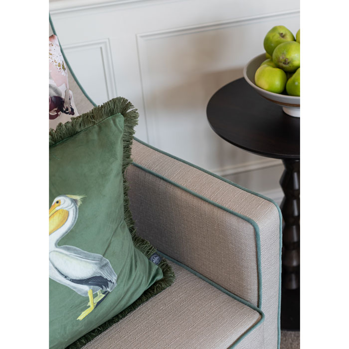 A close up of the Orto High Back Chair upholstered in Panaz Alba Putty with contrast piping in Luxe Performance Velvet Forest.