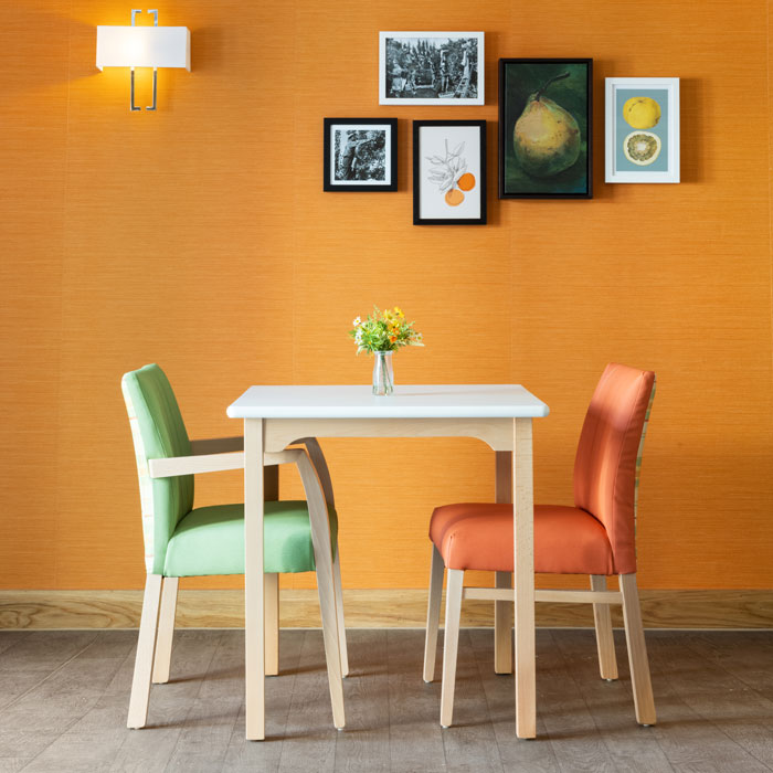 For the vibrant casual dining area, Drawing Room Interiors selected the SH Dining Table paired with the Pavia Arm Chair and Side Chair in contrasting colours, which creates a bright and colourful dining area for residents.