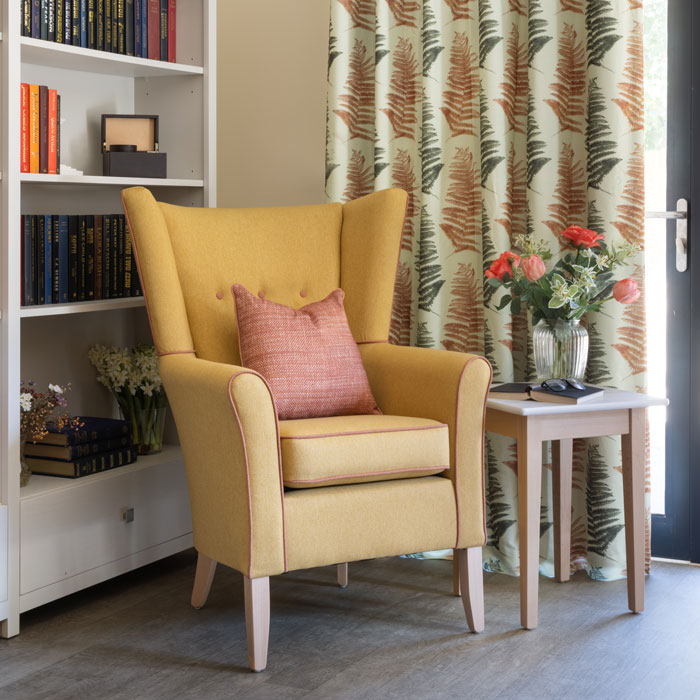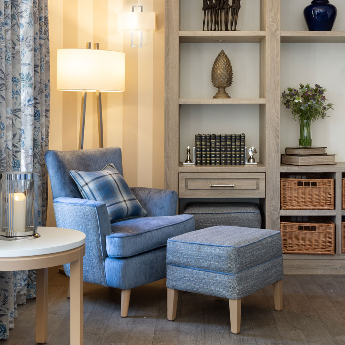 A Saluzzo Low Back Armchair with the Denia Footstool in a matching fabric provides a comfortable space for residents to relax in the quiet lounge.