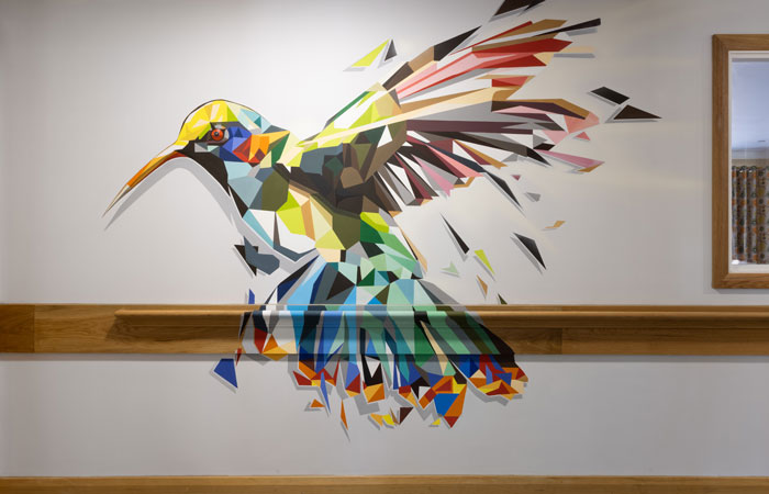 Wayfinding is an important part of the design as it helps residents navigate through the space with orientational cues. There are hand painted murals as well as themed artwork in the corridors. This artwork is all about local birds and bird watching, which leads to the bird watching area.