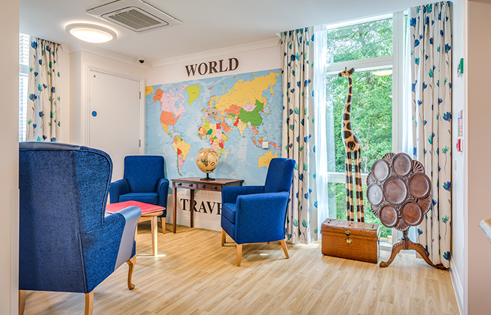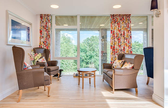 The bright colour scheme and large windows in the ground floor lounge brings the outside in. Franham Mill Nursign Home is really proud of their gardens, and it’s wonderful to open the windows on a sunny day so the residents can hear the ducks splashing in the pond.