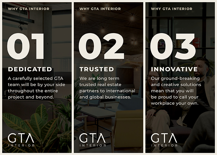 Part of our recent rebranding was to ensure that our brand identity accurately reflected us as a company, resulting in drawing out three pillars that define GTA Interior: Dedicated, Trusted and Innovative. Our team is committed and reliable, so our clients know they are in safe hands!