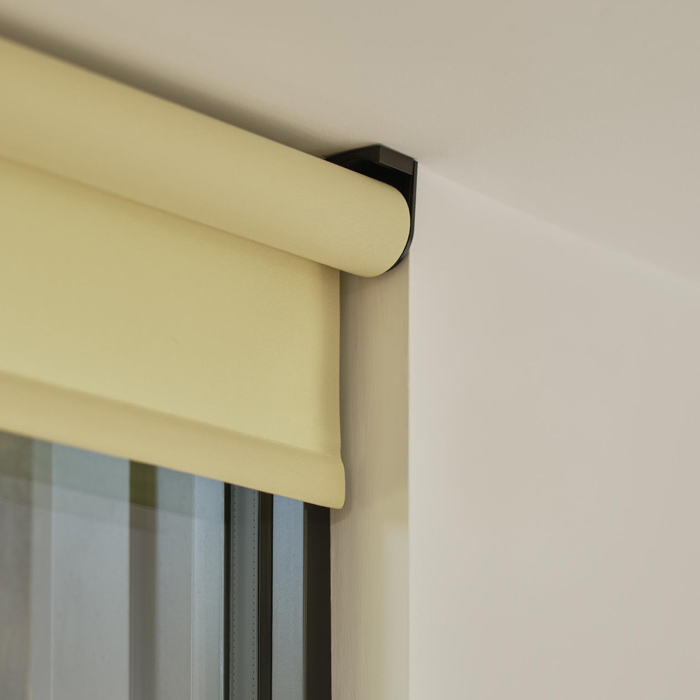 The Roman blind system features a refined headbox with stylish covers and an elegant fascia – concealing all technical components for an elegant aesthetic. All hardware components are completely available in black and white.
