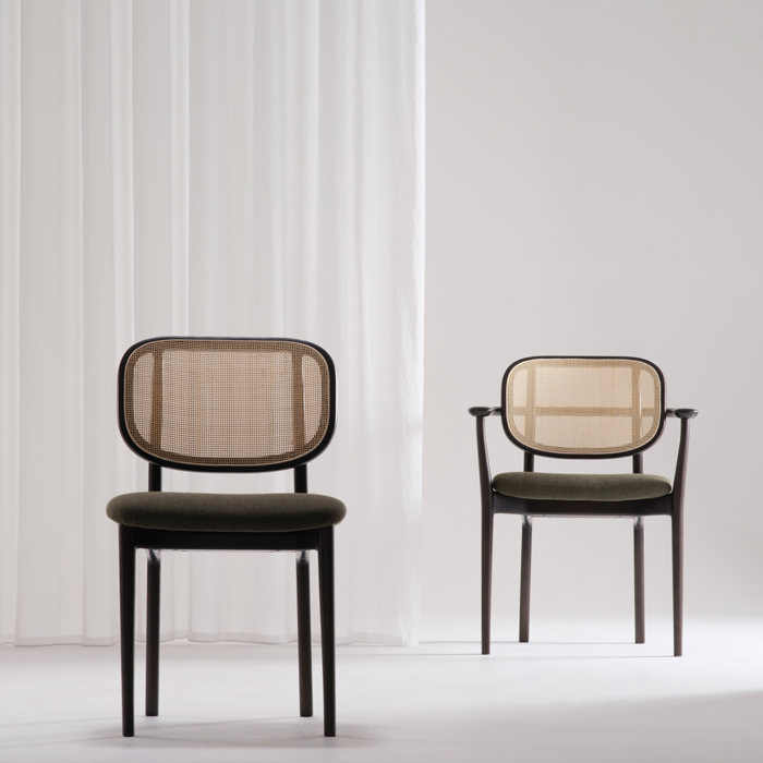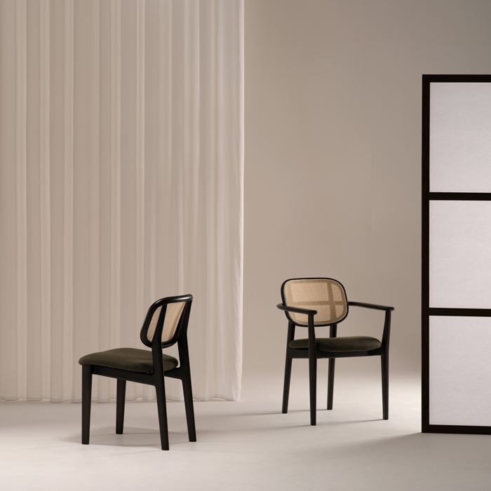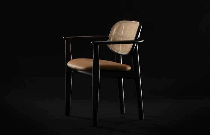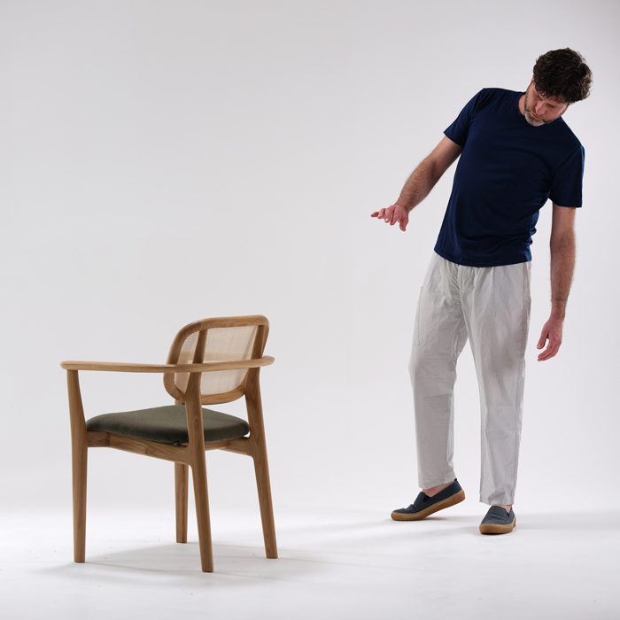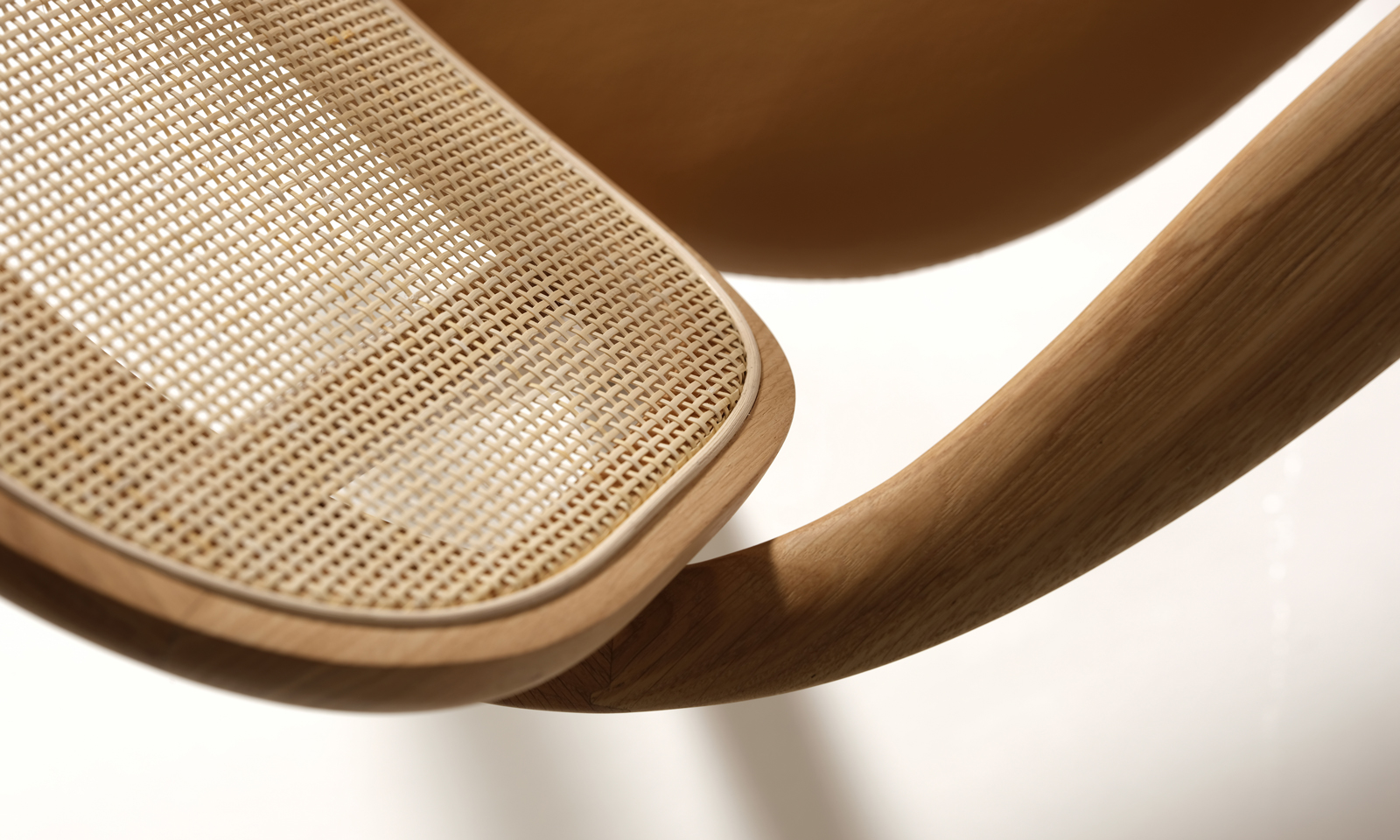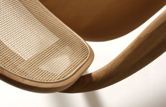 The design showcases a sculptural appearance with organic surfaces. The intricate weave pattern of the cane allows light to permeate through, illuminating the silhouette of the arm as it traverses the back of the chair with a distinct horizontal line. Magnus Long comments: “It was that simple motif that inspired the concept.”