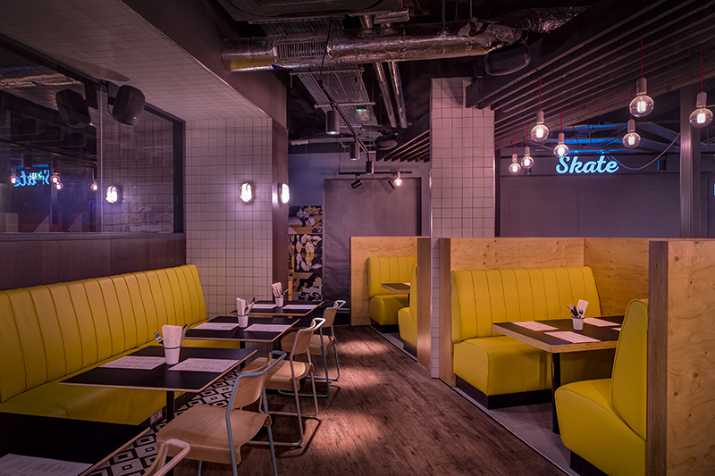 A prominent feature in the space is the striking illuminated signage showcasing the newly designed Queens Logo, which leads guests directly downstairs to the central hub of activity. The sense of ‘creating a journey’ is evident through the entire 45,000 sqft space, this was achieved by distinguishing the three leisure offerings, of skate, bowl and dine, through the use of block colour and varying materials; whilst ensuring that the sightlines between all three were kept open and clear.