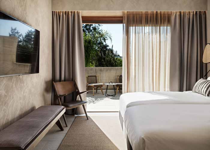 The 188 spacious rooms and suites have an inviting minimal ‘boho’ design, exuding refined elegance. Earthy tones and natural textures create a harmonious flow between the stunning surrounding nature with views of the Aegean Sea, and the relaxed indoor atmosphere.
