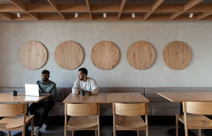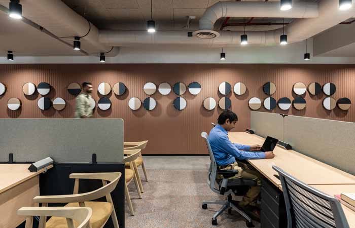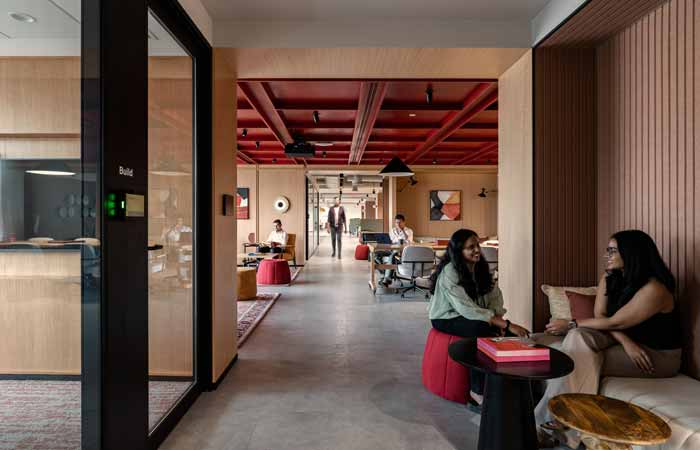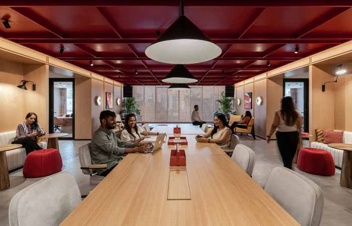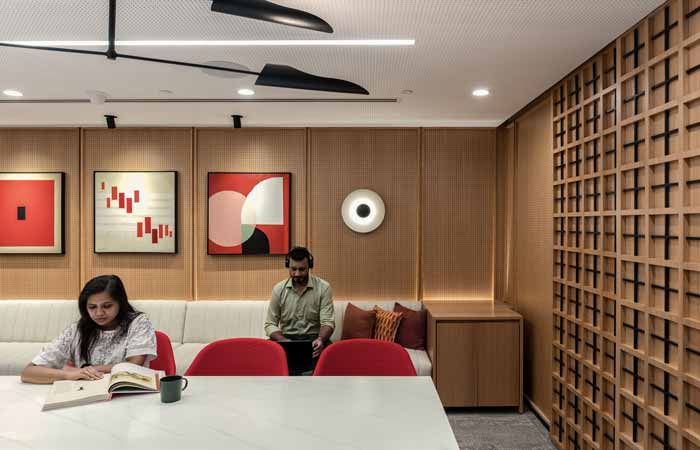 Upon entering Sony Music Mumbai, people are welcomed in The Lobby, where a Walk of Fame tells a story through portraits of its iconic roll call of artists, whilst a small display of vinyl albums in reception provides a glimpse of its rich heritage. The journey continues to The Library, a busy central hub where collaboration thrives and creativity flows freely. Here, people can engage in informal meetings and impromptu conversations. Serving as the heart of the workspace, this area is surrounded by team neighbourhoods, supported by workstations, meeting rooms and enclosed cabins, catering to a range of deep work and functional needs.