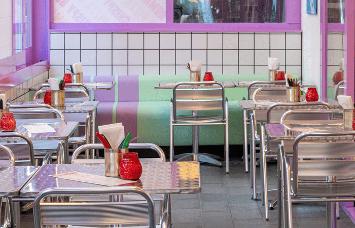 Beyond the banquettes, SCF supplied a dynamic mix of furniture options to enhance both aesthetics and functionality. Translucent bar stools, bold red and white chairs, and sleek aluminium-finish tables and chairs were thoughtfully placed throughout the space, ensuring cohesion with the overall retro-modern interior concept.