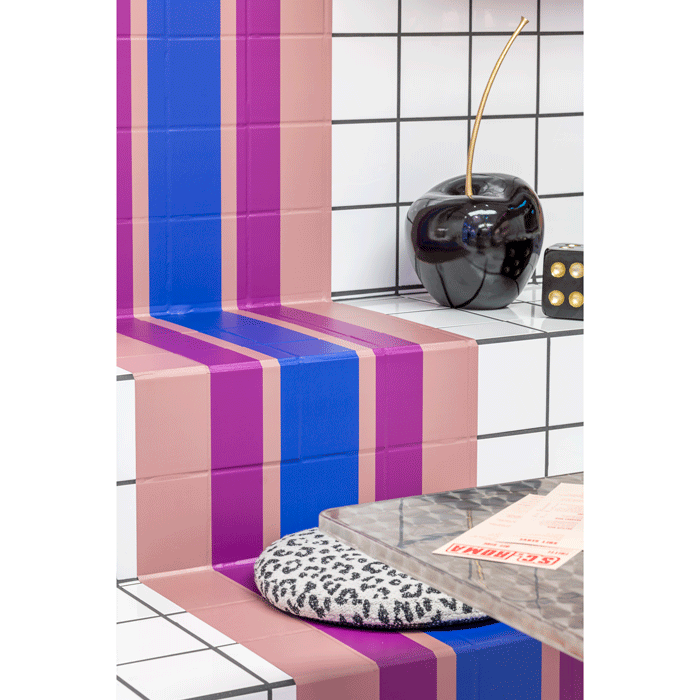 To bring the space to life, the design team embraced a grid of muted black and white wall tiles, providing a neutral backdrop for the vibrant graphic banners, Pop Art motifs, neon signage, and playful leopard-print accents. Clear materials, glossy mirrors, and shimmering metallic finishes were integrated to elevate the space’s lively and dynamic ambiance.