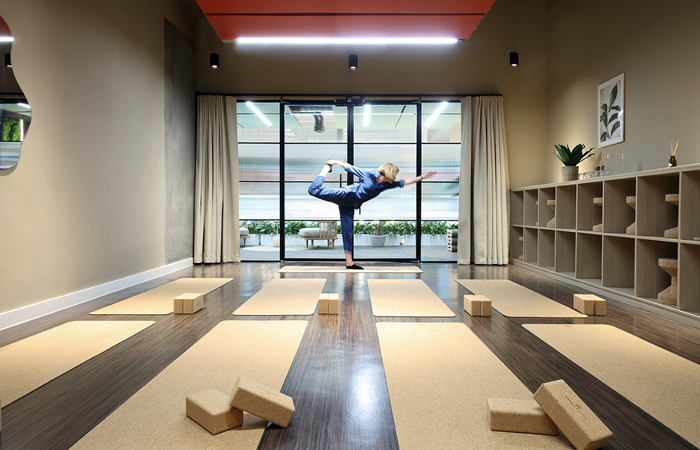 Planting includes troughs and plants known for climbing, which will create a green wall over time by wrapping around the balustrade. The canopy space also incorporates a treatment room and a full-size studio, featuring a sustainable and adaptable vinyl floor, to cater for a variety of wellness-related activities and treatments. The latter can also be booked as a presentation space, with a joinery unit that allows for yoga mats and small stools to be stored out of sight, embodying the scheme’s approach to adaptable spaces. A darker palette throughout the mezzanine area reflects this calm and meditative atmosphere, inspired by the concept of a tree house.
