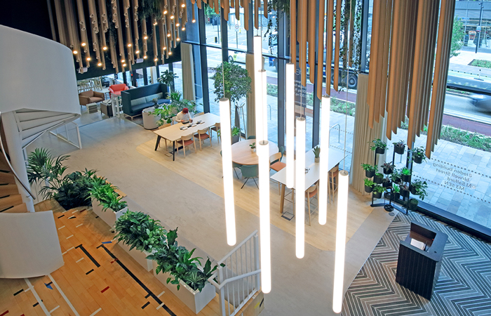 The lighting design for the scheme needed to help create a variety of zones with different moods for task-oriented work or relaxation. Lighting is also a major feature of the ground floor sculptural installation and was developed, as with the amenity lighting scheme throughout, with Paul Shoosmith of Light Forms. To enhance the scheme’s human-centric experience further, the majority of the light fixtures have tuneable white LEDs, allowing the colour temperature of the space to change to suit the environment and reflect natural circadian rhythms. All architectural fixtures are also DALI dimmable, enabling complete control of the light output and energy consumption throughout the space.