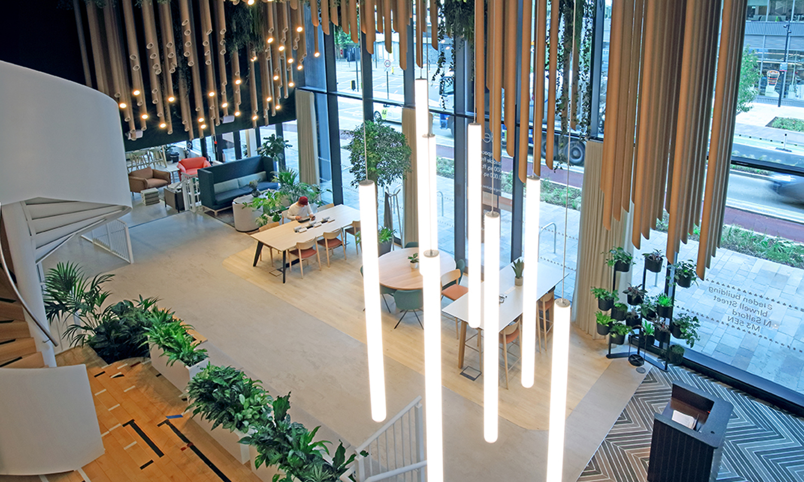 “Watching Eden emerge on Salford’s skyline over the last two years has been an incredible journey. We wanted the ground floor and mezzanine space to be a focal point for the building, attracting use from both tenants and the local community. We had to move away from the traditional office reception and create a space that could be used for collaboration, meeting, relaxing and events. The space also had to be done using sustainable materials and meeting the health and wellbeing aspirations for Eden. SpaceInvader got the brief right from the start and, once appointed, helped us develop this further. John and the team had some fantastic ideas and have done an incredible job of creating a very unique space at Eden.”