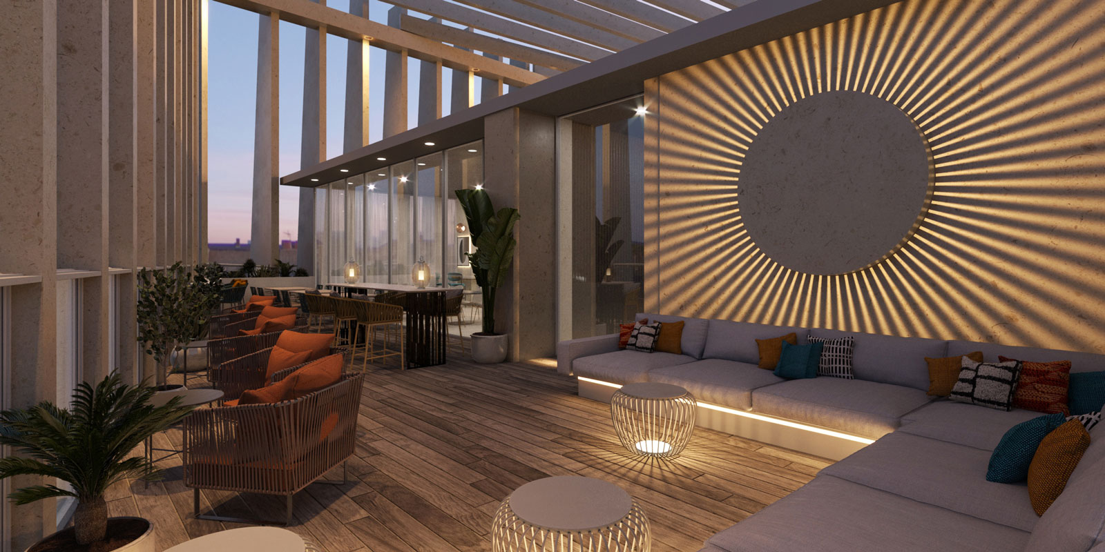 A sense of arrival will be created via bold feature corridor lighting, reflective of the Zoetrope, with glimpses through to the roof top pool to entice visitors and build intrigue. A softer lounge seating area will provide an intimate setting for guests to get comfortable and enjoy the views over Skypark and the airport runways. A feature mirror wall will also reflect the sunset from the south-west of the hotel, allowing the guests to be static, but enjoy the surrounding drama to the max – so that they themselves become the essence of the Zoetrope!
