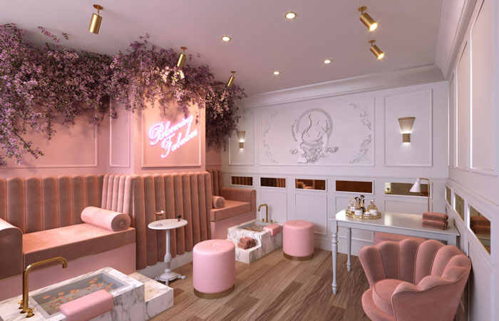 The Spa area boasts a super-feminine, indulgent scheme. Predominantly pink, its motifs include a feature raised peacock motif against the dove-grey wall panelling and faux cherry blossom dressing, nodding to the Orient and the Victorian taste for Chinoiserie. Plush pink velvet banquette seating sits below pink wall panelling, with neon ‘Blooming Fabulous’ wall signage adding to the space’s indulgent feel.
