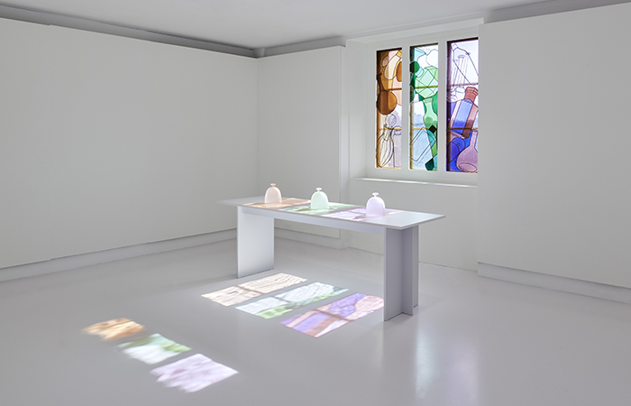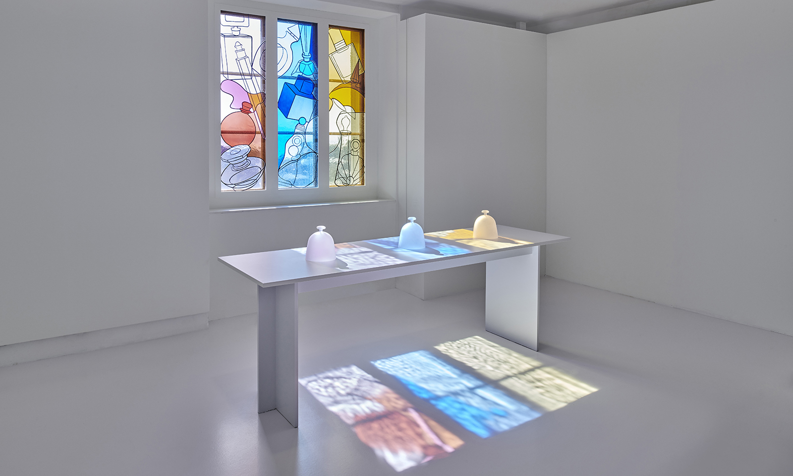 A centerpiece of the exhibition is a stained glass window, designed by Glithero, for the room of perfumers who draw inspiration from historic formulas. The window, depicting perfume bottles through the ages, creates a flood of coloured light that travels through space by day and occasionally brushes over the vessels of scent.