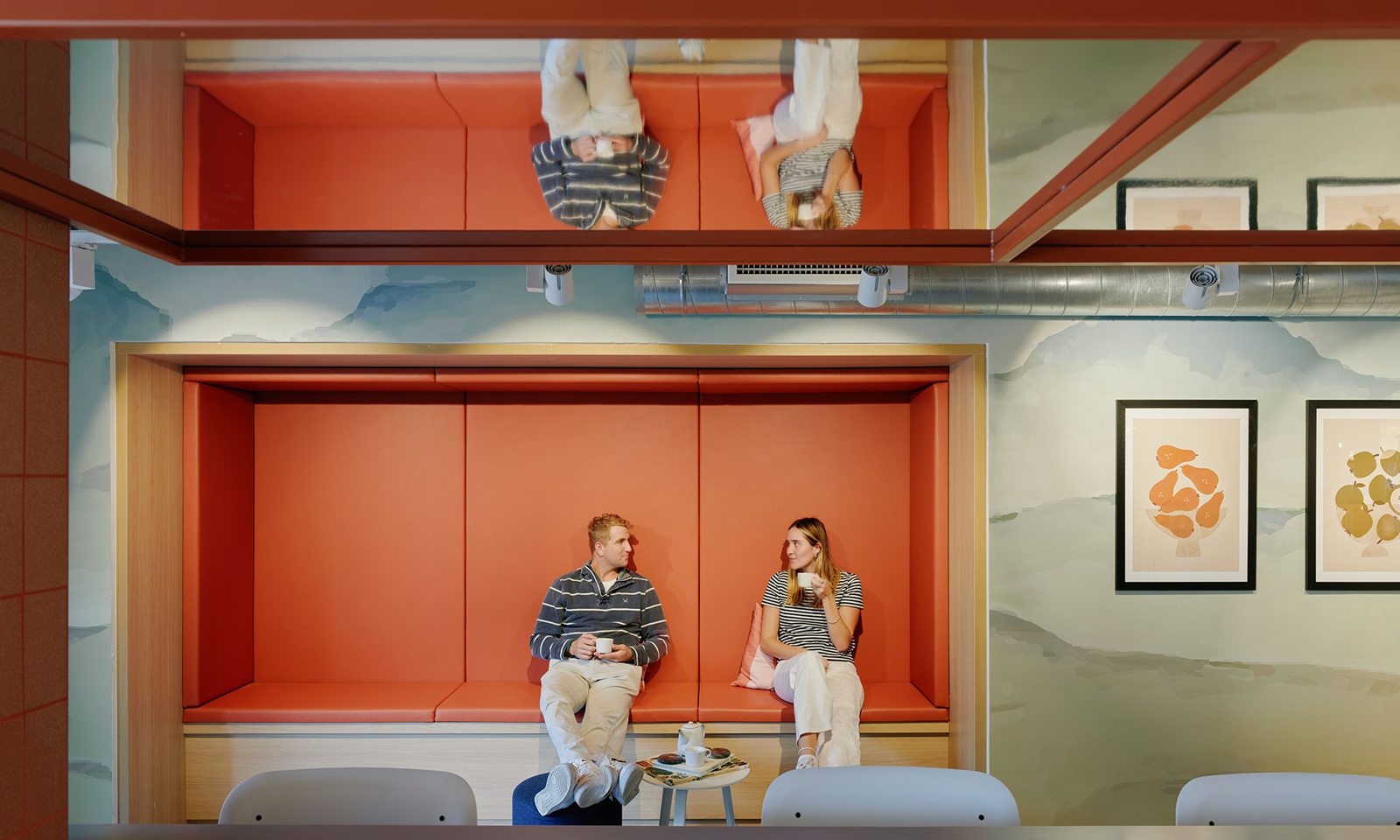 Special attention has been given to storage solutions, recognising their importance in maximising the functionality and comfort of each living space. This thoughtful design approach ensures that residents have everything they need within a compact, well- organised environment. JS+P used Ultrafabrics Brisa Cinnabar 533-8245 in the private dining space as the colours gave the vibrancy and depth, as well as practical functionality.